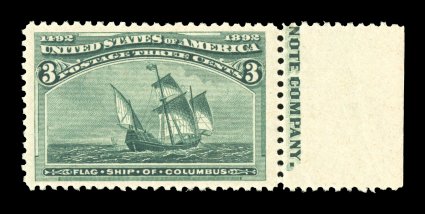 306 nh 232 image#232, 3c Columbian, right sheet-margin partial imprint single, deep vibrant color and a razor-sharp impression on clean white paper, exceptionally well centered within especially wide margins, unblemished o.g., n.h., extremely fine; 2003 PSE certificate. (Image) $150.00