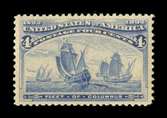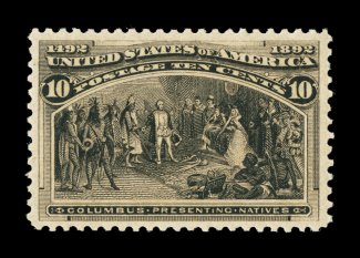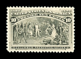 318 nh 237 image#237, 10c Columbian, exceedingly well centered and margined, rich color and a clean impression, fresh o.g., n.h., extremely fine; 1996 PSE certificate for a block of four, this being the bottom right stamp. (Image) $350.00