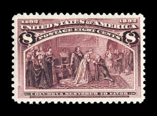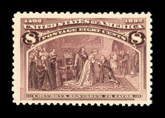 314 nh 236 image#236, 8c Columbian, exceptionally well centered within extravagantly large margins which are most uncommon on this value, beautiful rich color and a crisp detailed impression, o.g., n.h., extremely fine gem; 2003 PF certificate. (Image) $200.00