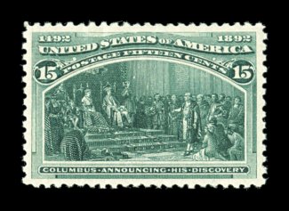 319 nh 238 image#238, 15c Columbian, wonderfully well centered within large margins, sumptuously rich color and an especially crisp impression on clean white paper, o.g., n.h., a natural gum crease is the only thing keep this stamp out of the gem category, extremely fine; clear 1999 PF certificate. (Image) $750.00