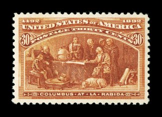 320 nhu 239 image#239, 30c Columbian, a marvelously choice mint example, being extraordinarily well centered amid extravagantly large margins which are most uncharacteristic of this value, plus its color is especially deep and luxuriant, while its impression is razor sharp on brilliantly fresh paper, unblemished o.g., n.h., extremely fine gem; 1999 PF certificate and a 2007 PSE certificate (XF 90 - we think a grade of 95 would be more appropriate given this stamp's impressive overall attributes; SMQ $2,450.00). (Image) $900.00