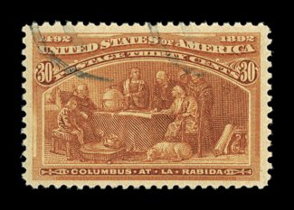 322 Ou 239 image#239, 30c Columbian, premium used single, very well centered within extraordinarily large margins, sumptuously rich color and a crisp impression, unusually light cancel, extremely fine; 2005 PSE certificate (XF 90; SMQ $230.00). (Image) $90.00