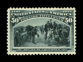 323 nh 240 image#240, 50c Columbian, a most impressive mint single, featuring intense prooflike color and impression on fresh paper, plus it is exceptionally well centered within particularly large margins, pristine o.g., n.h., extremely fine; premium quality never hinged Fifty Cent Columbians are few and far between; 1984 and 1997 PF certificates. (Image) $1,750.00