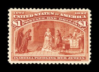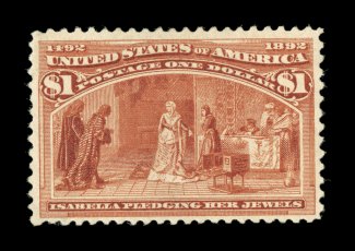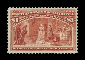 324 og 241 image#241, $1.00 Columbian, especially attractive mint single, uncharacteristically well centered and margined, bright fresh color, o.g., lightly hinged, extremely fine; 1995 PF certificate. (Image) $1,200.00