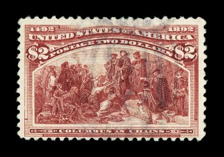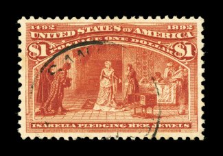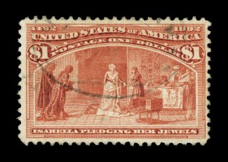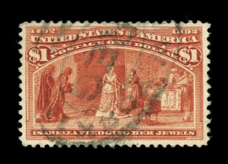 327 Ou 241 image#241, $1.00 Columbian, a fabulous quality used example, possessing deep "fiery" color and an especially intense impression on fresh paper, in addition it is marvelously well centered within extravagantly large margins (most uncommon on this value), its cancel is uncharacteristically light and unobtrusive, an extremely fine gem in every regard; 2002 PF certificate and a 2006 PF certificate (XF-Superb 95; SMQ $2,750.00); this is the highest grade awarded to a used One Dollar Columbian by either the PF or PSE. (Image) $650.00