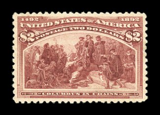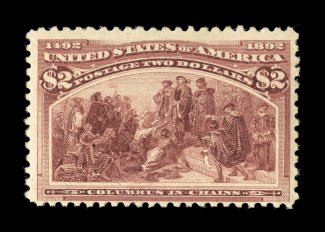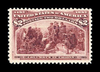 331 nh 242 image#242, $2.00 Columbian, a most remarkable mint example, with color and paper as fresh as the day it was issued, gloriously rich color and a prooflike impression on bright white paper, crisp intact perforations all around, particularly well centered within large margins, immaculate o.g. in the freshest state of preservation imaginable, never hinged, a very fine and incredibly choice never hinged Two Dollar Columbian, one of the rarest of all the commemorative issues to find both never hinged and in premium condition; 2000 PF certificate; ex-Lewis. (Image) $4,100.00