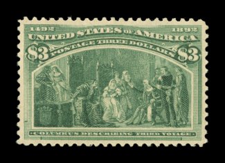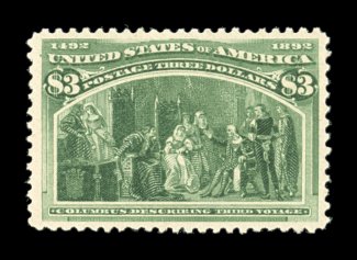 337 og 243a image#243a, $3.00 Columbian, the olive green shade, a lovely mint example, featuring rich luxuriant color in the distinctive olive green shade, well defined impression on fresh white paper, excellent centering within large margins, o.g., lightly hinged, extremely fine and quite choice; 1997 PF certificate. (Image) $1,900.00