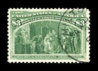 336 Ou 243 image#243, $3.00 Columbian, exceedingly bright and fresh, with beautiful rich color on pristine white paper, nicely centered within large margins, neatly struck c.d.s. pmk., very fine; 2002 PF certificate and a 2006 PF certificate (VF 80; SMQ $1,050.00). (Image) $1,000.00