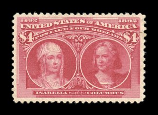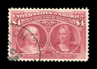 339 Ou 244 image#244, $4.00 Columbian, a marvelous quality used example, being extraordinarily well centered within large margins, gorgeous color and a clean impression, unusually light c.d.s. pmk. attractively struck in the bottom left corner, extremely fine among the finest used examples we have had the pleasure to offer; 2002 PF certificate and a 2006 PF certificate (VF-XF 85; SMQ $1,850.00). (Image) $1,300.00