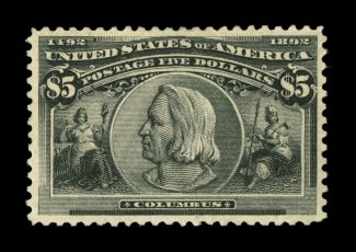 340 ogu 245 image#245, $5.00 Columbian, exceedingly well centered example of this key Columbian issue, attractive rich color with a razor sharp detailed impression on bright paper, surrounded by crisp even perforations, full fresh o.g., lightly hinged, extremely fine and an especially handsome example of this popular stamp; 1994 PF and 2005 PSE certificates (XF 90; SMQ $4,800.00 ). (Image) $3,000.00