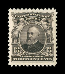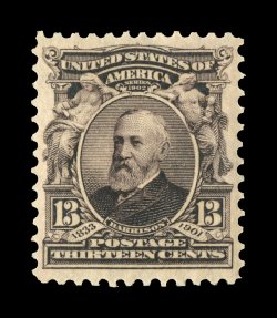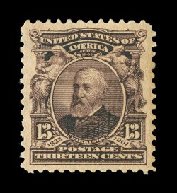 464 nh 308 image#308, 13c Purple black, exceptionally well centered within large to extra-large balanced margins, strong rich color and a sharp detailed impression, immaculate o.g., n.h., extremely fine; 2006 PF certificate. (Image) $115.00