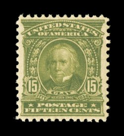 467 nhu 309 image#309, 15c Olive green, excellent centering, sumptuously rich color and a crisp detailed impression, unblemished o.g., n.h., extremely fine; 1996 PF certificate for a block of four, this being the top right stamp, and a 2005 PSE certificate for the single (VF-XF 85; SMQ $920.00). (Image) $475.00