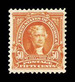 469 nhu 310 image#310, 50c Orange, a magnificent mint single that is wonderfully well centered within margins that are exceedingly large for this stamp, gorgeous bright color and a crisp detailed impression on immaculate white paper, pristine o.g. without a single bend or skip, n.h., extremely fine; gem never hinged examples of the Fifty Cent 1902 Issue are rarely offered; 2007 PSE certificate (XF 90; SMQ $4,000.00). (Image) $1,300.00