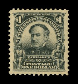 473 ogu 311 image#311, $1.00 Black, an exceptionally choice mint single that is impeccably well centered amid extravagantly large margins, strong color and a crisp detailed impression, full clean o.g. with just the barest trace of hinging, extremely fine; a most impressive stamp; 2000 PF and 2005 PSE certificates (XF-Superb 95; SMQ $1,600.00). (Image) $750.00