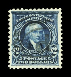 475 Ou 312 image#312, $2.00 Dark blue, a most impressive used example, possessing incredibly deep prooflike color and impression on clean white paper, plus it is exceedingly well centered within very large margins, lightly cancelled, extremely fine; not often encountered in this select used condition; 1993 PF certificate and a 2005 PSE certificate (VF-XF 85; SMQ $305.00). (Image) $200.00