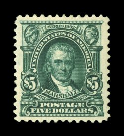 478 Ou 313 image#313, $5.00 Dark green, used, well centered within extraordinarily large margins, deep intense color and impression, light face-free cancel confined to the top left of the stamp, extremely fine; 2003 PSE certificate and a 2006 PF certificate (VF-XF 85; SMQ $1,000.00). (Image) $750.00