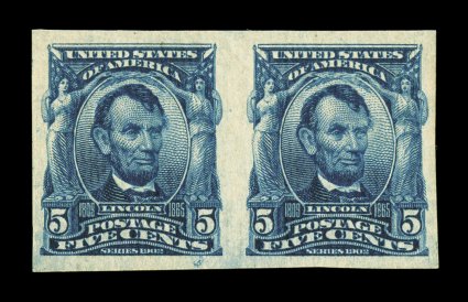 480 nh 315 image#315, 5c Blue imperforate, exceptionally choice horizontal pair, uniformly large margins all around, deep luxuriant color and impression on particularly fresh paper, o.g., n.h., extremely fine; a gem pair; 2002 PF certificate; ex-Killien. (Image) $875.00