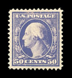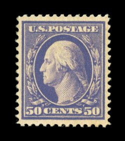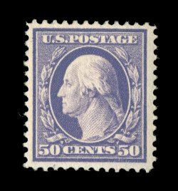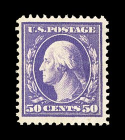 523 nh 341 image#341, 50c Violet, a most impressive mint example, possessing absolutely gorgeous color that is especially rich and intense, excellent clarity of impression on bright white paper, exceedingly well centered within unusually large margins, pristine o.g., n.h., extremely fine; a terribly challenging stamp to find both this choice and never hinged; 1997 PSE certificate (bottom selvage subsequently removed). (Image) $800.00