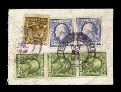 527 EDU 341 image#341, 50c Violet, horizontal pair along with 4c Brown (#303) and 8c Olive green vertical strip of three (#339), all tied by "Fairbanks, Alaska/ Registered/Oct. 23, 1909" double circle c.d.s. to large portion of register bank tag for a heavy package (first or fourth class mail being almost certainly a gold shipment tag), this being the earliest documented usage of the scarce 50c Violet, posted to the National Bank of Commerce in Seattle, Washington, flaws to stamps as is usually found on parcel tags, fine and impressive franking; 2003 APS certificate; ex-"Alpha". (Image) Est. 500-750