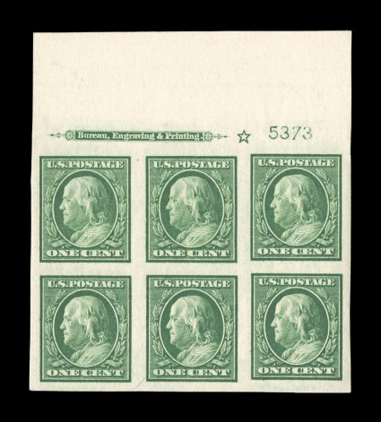 528 nhPB 343 image#343, 1c Green imperforate, gem full top margin imprint, star and plate no. 5373 block of six, extravagantly large and uniformly even margins all around, bright color, o.g., n.h., extremely fine; a plate block for the perfectionist; ex-Gray. (Image) $90.00