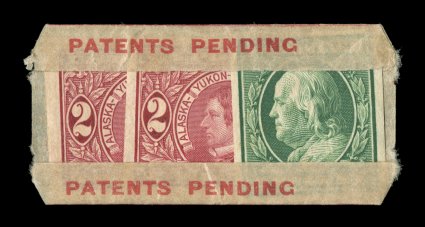 529 nh 343 var., 371 image#343 var., 371, 1c Green and 2c Alaska-Yukon imperforates, a single of the former and two of the latter, enclosed within U.S. Automatic Vending Co. pocket Ty. 3-1, with red "Patents Pending" on the front and serial number 493 printed in red on reverse, the 1c stamp was also perforated with Type 1 perforations of this company, small flaws to the pocket fold over tabs, stamps o.g., n.h., very fine. (Image) $1,000.00