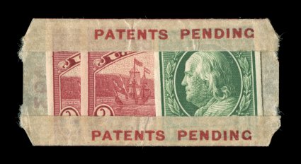 530 nh 343, 373 image#343, 371, 1c Green and 2c Hudson-Fulton imperforates, a single of the former and two of the latter, enclosed within U.S. Automatic Vending Co. pocket Ty. 3-2, with "Patents Pending" on the front and serial number 093 printed in red on reverse, also a violet "U.S./Automatic Stamp/and/Ticket Selling Machines/No.1 Madison Ave." handstamp on the reverse, a variety that is not listed in Scott, small flaws to the pocket fold over tabs, stamps o.g., n.h., very fine; a rare variety of these unique vending pockets. (Image) $800.00+