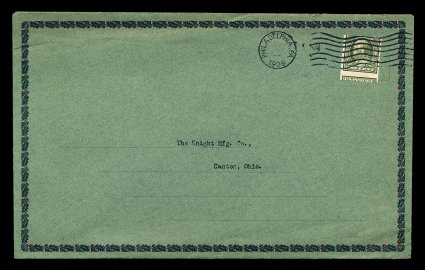 531 EDU 343V image#343V, 1c Green imperforate coil, vertical format, tied to lovely and unusual cover, being a large size Christmas card envelope in green that is almost identical to the color of the stamp, petite green and red printed holly border, the stamp is unquestionably a vertical format imperforate coil as it was applied by a Simplex plunger-style affixing device that miscut it through the top labels and having the top portion of the stamp below, furthermore this is a most unusually determined earliest documented usage for this coil, the stamp is tied by "Philadelphia, Pa/1909" machine cancel with no month or day designation as is usual on printed matter, yet it can be determined to be the earliest documented usage as there are no other covers known used as early as 1909, very fine; 2004 APS certificate; ex-"Alpha". (Image) Est. 750-1,000