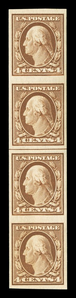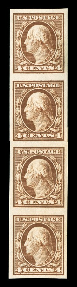 532 og 346V image#346V, 4c Orange brown imperforate coil, pasteup strip of four, large balanced margins all around, deep rich color, o.g., quite lightly hinged, position 3 n.h., extremely fine and rare; catalog value is for a paste up pair since the more desirable strips of four are not listed for pasteups; 2007 PF certificate. (Image) $250.00+