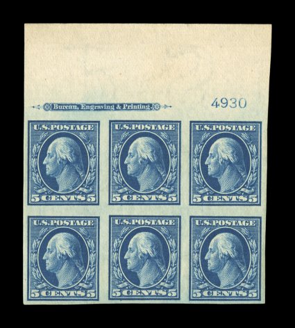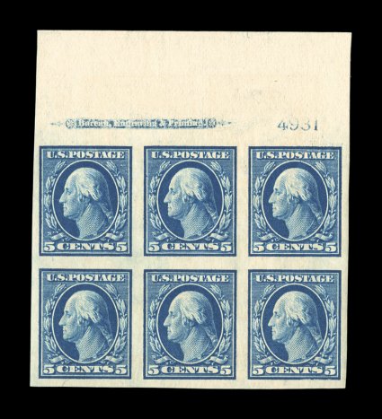 534 nhPB 347 image#347, 5c Blue imperforate, lovely full top margin imprint and plate no. 4931 block of six, very large margins all around, deep luxuriant color, o.g., n.h., extremely fine and exceedingly choice. (Image) $500.00