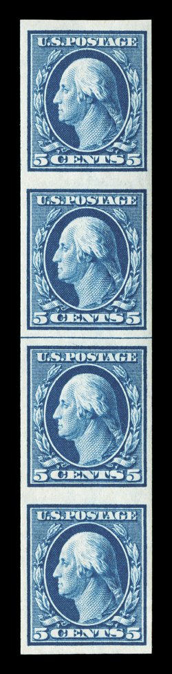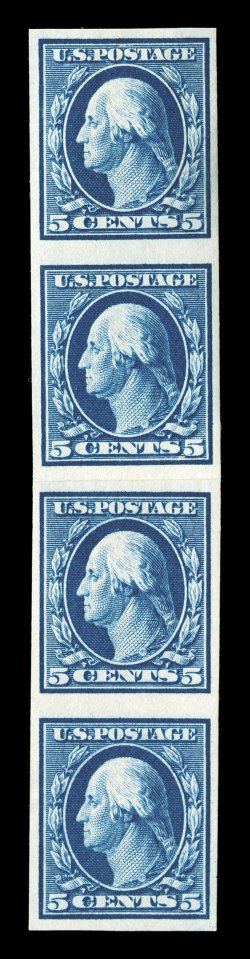 536 og 347V image#347V, 5c Blue imperforate coil, pasteup strip of four, exceptionally well centered with virtually perfectly balanced margins all around, deep color and prooflike impression, fresh o.g., relatively lightly hinged in the top and bottom stamps, the pasteup pair is never hinged, extremely fine and rare in this stellar quality; Scott does not list a pasteup for this value either as a pair or a strip; 2007 PF certificate. (Image) Est. 300-400