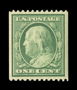 540 nh 348 image#348, 1c Green coil, perf. 12 horiz., guide line pair, uncommonly well centered and margined, bright fresh color, immaculate o.g., n.h., choice very fine; 2007 PF certificate. (Image) $600.00