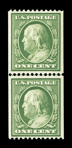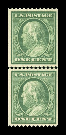 539 nh 348 image#348, 1c Green coil, perf. 12 horiz., select quality guide line pair, remarkably bright and fresh, with strong rich color and a highly detailed impression on crisp white paper, immaculate o.g., n.h., extremely fine; a gem line pair; 2005 PF certificate and a 2006 PSE certificate. (Image) $600.00