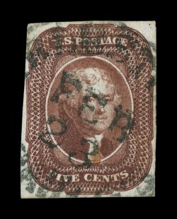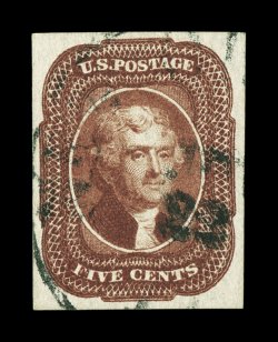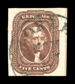 41 Ou 12 image#12, 5c Red brown, position 10L, a phenomenal used example from the top right corner position on the sheet, with a huge right margin showing the guide line, other three margins also large, spectacularly intense color and a well incised impression on incredibly fresh paper, light New Orleans town c.d.s., an extremely fine; gem; among the finest used 1851 Five Cent Red Browns we have offered; 2006 PF certificate (XF-Superb 95; SMQ $2,600.00); ex-Ishikawa, Mayer. (Image) $950.00