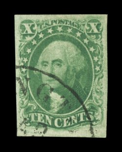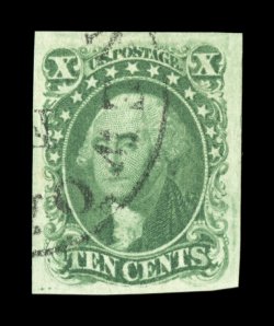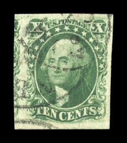 47 Ou 13 image#13, 10c Green, Ty. I, an exceedingly choice used single, featuring four extra-large and even margins, strong rich color and a well defined impression, unusually light town cancel, extremely fine; an especially desirable example; 2002 and 2006 PF certificates (latter grading XF 90; SMQ $1,650.00). (Image) $900.00