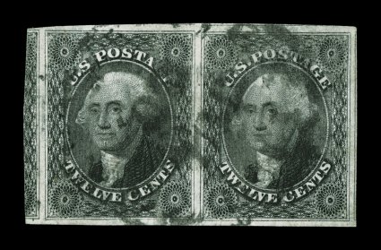 57 O 17 image#17, 12c Black, a spectacular used horizontal pair, possessing impressive physical characteristics that are rarely seen on any size multiple of this stamp, with extraordinarily large margins all around including a significant portion of the adjoining stamp at left, plus its color is a remarkably deep "jet" black shade, while its impression is especially intense on fresh white paper, town c.d.s. postmarks, an extremely fine pair, with the right stamp being a superb gem; 1997 PF certificate and a 2007 PSE certificate. (Image) $750.00