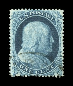 59 Ou 19 image#19, 1c Blue, Ty. Ia, position 100R4, an exciting used example of one of the most challenging 19th century Untied States stamps to find in premium quality, as the overwhelming majority are quite off centered and/or have faults, this particular example is impeccably well centered, but just as impressive is the deep prooflike color and impression on bright white paper, an unusually light town cancel further contributes to the stamp's desirability, an extremely fine gem and an immense rarity in this outstanding condition; 1971 PF certificate (when on cover), 1998 PF certificate and a 2004 PSE certificate (XF 90; SMQ $38,500.00); this is, by far, the highest grade the PSE has assigned to this stamp, being the sole example to grade XF 90 (the next highest grade is only a 30!). (Image) $10,000.00