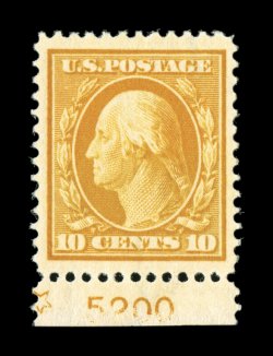 583 nhu 381 image#381, 10c Yellow, bottom margin plate no. 5200 single, brilliant color, very well centered within uncharacteristically large margins, o.g., n.h., extremely fine (2006 PSE certificate (XF 90; SMQ $800.00). (Image) $250.00