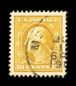 584 Ou 381 image#381, 10c Yellow, an incredible used single, possessing enormously large margins all around and being magnificently centered within them, brilliant color, light c.d.s. cancel, extremely fine gem; 2005 PSE certificate (XF-Superb 95 Jumbo; SMQ $145.00 for 95 and $370.00 for 98). (Image) $6.00