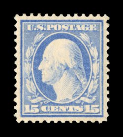 585 ogu 382 image#382, 15c Pale ultramarine, impressive mint single, being wonderfully well centered within extraordinarily large margins for any value in this series, let alone the high value, very fresh color and paper, o.g., lightly hinged, extremely fine; a surprisingly difficult stamp to fine in this outstanding quality; 2007 PSE certificate (XF-Superb 95; SMQ $830.00). (Image) $275.00