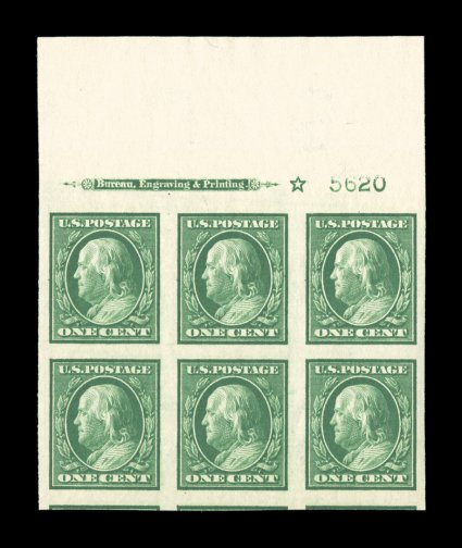 586 nhPB 383 image#383, 1c Green imperforate, gem full top margin imprint, star and plate no. 5620 block of six, lavishly large margins all around, including showing a small portion of three adjoining stamps at bottom, brilliantly fresh, strong rich color, o.g., n.h., extremely fine; a pristine plate block; ex-Folgelson. (Image) $67.50