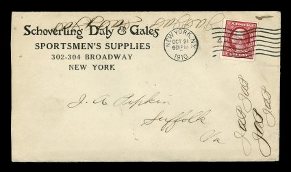 587 EDU 384V image#384V, 2c Carmine imperforate coil, vertical format, attractive single being well centered with large margins, October 21, 1910 earliest documented usage, stamp applied by Simplex affixing machine and tied to Schoverling Daly and Gales Sportsman's Supplies corner card cover by New York, N.Y. machine cancel, backstamped Suffolk, Va. the next day, some contemporaneous doodling, mostly on the reverse, very fine; this government issued coil actually predates the sheet imperforates by six weeks and is in fact the earliest documented usage of any single line watermarked stamp, making this a highly important cover for the postal history collector of the Washington-Franklin issues; 2003 APS certificate; ex-"Alpha". (Image) Est. 3,000-4,000