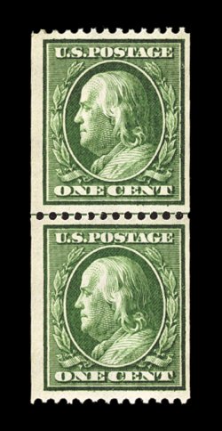 588 nh 385 image#385, 1c Green coil, perf. 12 horiz., guide line pair, strong rich color, nicely centered, o.g., n.h., a very fine example of this scarce line pair; 1986 and 2003 PF certificates. (Image) $1,000.00