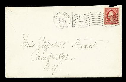 589 EDU 386 image#386, 2c Carmine coil, perf. 12 horiz., attractive appearing single that is well centered with bright color, tied to cover to Cambridge, N.Y. by neat Pittsfield, Mass. machine flag cancel, dated December 9, 1910, the earliest documented usage, backstamped the same day; edge tears in opening barely affecting the stamp but not affecting this cover's very fine appearance; a very early date for any of the single line watermarked stamps; 2001 APS certificate; ex-Hart, "Alpha". (Image) Est. 750-1,000