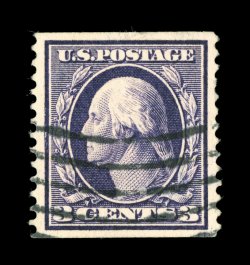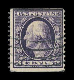 590 O 389 image#389, 3c Deep violet, Ty. I, "Orangeburg Coil", perf. 12 vert., a marvelous and choice appearing used example of this rare and sought after coil, which was issued specifically for use by the Bell Pharmaceutical Co. to mail their samples to doctors, the centering is remarkable, being virtually perfect amid considerably larger margins than typically found, additionally its color is the characteristic deep violet shade, neat and unobtrusive wavy line machine postmark, small reinforced diagonal crease at top center (which are endemic to virtually all known copies) and certainly not affecting this stamp's extraordinary extremely fine appearance; a highly desirable example of this major 20th century coil rarity, certainly among the best centered and margined available of the approximately 75 known used copies recorded; 2002 PF certificate. (Image) $10,000.00