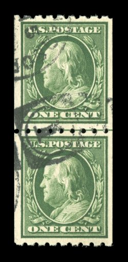 592 O 390 image#390, 1c Green coil, perf. 8 1/2 horiz., used guide line pair, outstanding centering within unusually wide margins, deep luxuriant color and a razor-sharp impression, neat duplex cancel; extremely fine; despite its relatively modest catalog value, certified gem used line pairs of this stamp are extremely difficult to come by. (Image) $95.00
