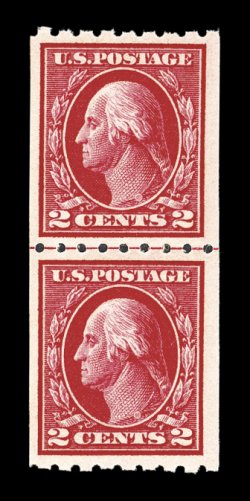 593 nh 391 image#391, 2c Carmine coil, perf. 8 1/2 horiz., choice quality guide line pair, with dazzling bright color and a deeply etched impression on fresh crisp paper, exceedingly well centered within large margins, immaculate o.g., n.h., extremely fine; a very scarce line pair in this select condition; 2000 PF certificate. (Image) $550.00