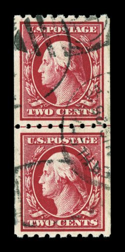 594 O 391 image#391, 2c Carmine coil, perf. 8 1/2 horiz., guide line pair, used, extraordinarily well centered within very large margins, deep luxuriant color, Pennsylvania town duplex cancel, extremely fine; an exceptionally rare used line pair that rarely makes its appearance in the auction market, especially in this highly select quality; 2007 PF certificate. (Image) $1,350.00