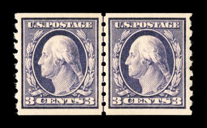 596 nhu 394 image#394, 3c Deep violet coil, perf. 8 1/2 vert., an extraordinary quality guide line pair, marvelously well centered within large margins, rich luxuriant color and a clean impression on bright white paper, unblemished o.g., n.h., extremely fine; a gem line pair; 2002 PF and accompanied by 2002 and 2006 PSE certificates (the last graded XF 90; SMQ $1,950.00). (Image) $900.00