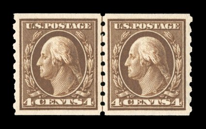 597 nhu 395 image#395, 4c Brown coil, perf. 8 1/2 vert., scarce guide line pair, extraordinarily well centered amid large margins, deep luxuriant color and a much stronger impression than normally found, o.g., n.h., extremely fine; 2007 PSE certificate (XF 90; SMQ $1,950.00). (Image) $1,100.00