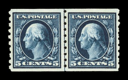 598 nh 396 image#396, 5c Blue coil, perf. 8 1/2 vert., guide line pair, exceptionally well centered, beautiful color that is uncommonly rich and intense, razor-sharp impression on bright white paper, unblemished o.g., n.h., extremely fine; 2003 PF certificate. (Image) $900.00